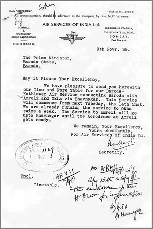 State communication records in the Baroda Archives reveal that HH the Gaekwar of Baroda sought to establish air links through the state. In 1937, proposals were made to Tata Sons Limited for routes including Baroda-Ahmedabad, Baroda-Indore, and Baroda-Kathiawar. Indian National Airways Limited also pitched services from Bombay to Baroda-Udaipur-Jodhpur-Bikaner-Lahore. These plans did not materialize.